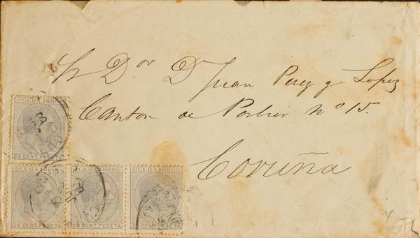59(4). 1880. 25 gray cts, strip of three and one stamp. HAVANA to CORUÑA (SPAIN). On the back arrival. MAGNIFICENT AND RARE POSTAGE.