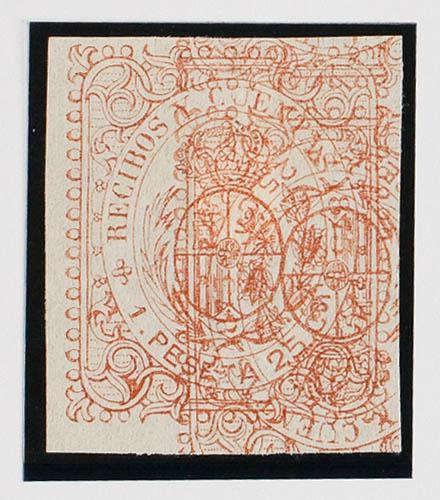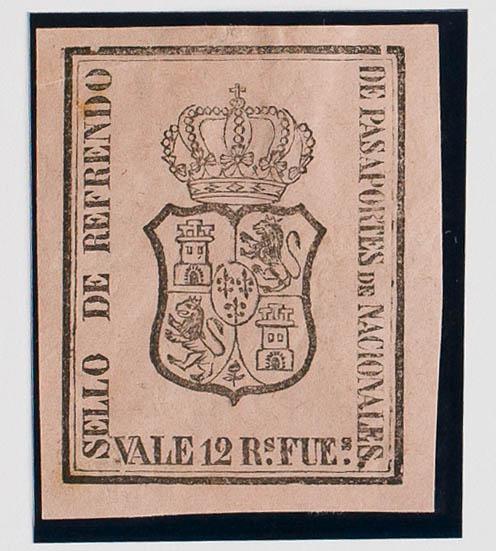 (★)1871. ENDORSEMENT STAMPS from 1871. 12 reales black on pink. OF NATIONAL PASSPORTS. MAGNIFICENT. (Jones and Rodriguez BD3)