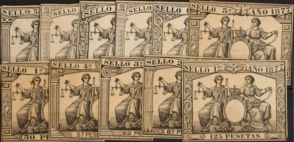 (★)1877. STAMPED PAPER of 1877. Complete series, eleven values (printed in black and on cardboard), different values but the same design as the series issued for Spain. MAGNIFICENT AND RARE.