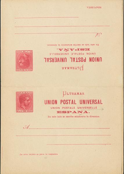 (★) EP13. 1882. 2 cts + 2 cts carmine on round-trip postal card. MAGNIFICENT. Edifil 2008: 34 Euros