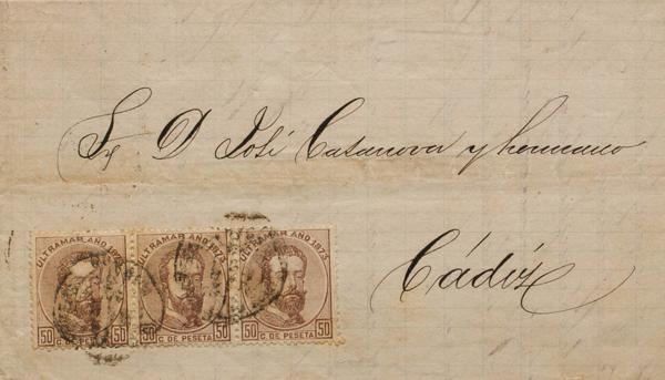 1873. 50 chestnut cts, strip of three. HAVANA to CADIZ. MAGNIFICENT AND EXTREMELY RARE COMBINATION OF POSTAGE DESTINATION TO THE PENINSULA.