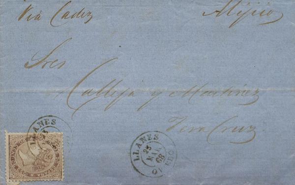 92. 1868. 20 cts lilac. LLANES to VERACRUZ (MEXICO). Postmark LLANES / OVIEDO. Circulated via Cádiz and Havana through Spanish ships whose rate was half, although it took longer to reach its destination. MAGNIFICENT AND RARE.