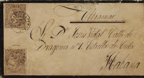 98(2). 1869. 50 mils violet, two stamps. CASTROPOL to HAVANA (CUBA). Postmark CASTROPOL / OVIEDO. MAGNIFICENT AND UNUSUAL COMBINATION OF POSTAGE TO MAKE UP THE 100 MILES TO CUBA.