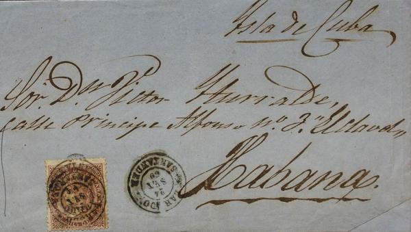 25. 1872. 12 cts lilac. HAVANA to SANTIAGO. Postmark STEAM / DE LA / HAVANA. MAGNIFICENT AND EXTRAORDINARILY RARE USE OF THIS POSTMARK.