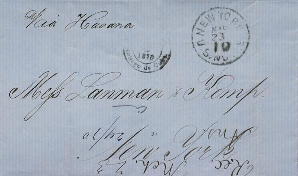 1870. SANTIAGO DE CUBA to NEW YORK (USA), forwarded by the agent RMARQUETTE AND Cº (mark on the back) where it is deposited in the mail. Dater NEW YORK / USNOTES / 10. MAGNIFICENT.