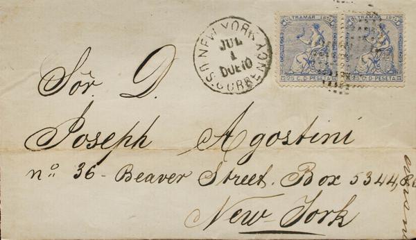 28(2). 1874. 25 overseas cts, pair. SANTIAGO DE CUBA to NEW YORK (USA). Postmark GRILL OF POINTS (circular) and date stamp NEW YORK / DUE 10 / US CURRENCY on the front. MAGNIFICENT AND RARE.