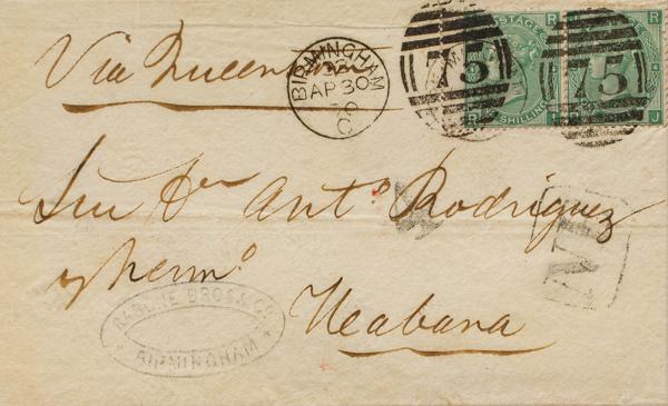 1870. 1 sh green, pair. BIRMIMGHAM to HAVANA. Duplex postmark BIRMINGHAM / 75 and on the front mark NE, in black of the Empresa de Correos Marítimos de La Habana and porterage "4". MAGNIFICENT AND RARE.