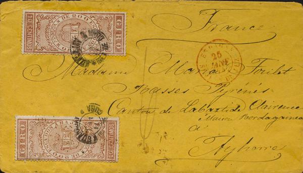 1874. 10 cts chestnut GIRO, two stamps. GUANAJUAY to AYHERERRE (FRANCE), circulated via Madrid and Bayonne. Postmark GUANAJUAY / ISLAND OF CUBA. MAGNIFICENT AND VERY RARE POSTAL USE WITH TAX STAMPS, POSSIBLY THE ONLY ONE CIRCULATED ABROAD.