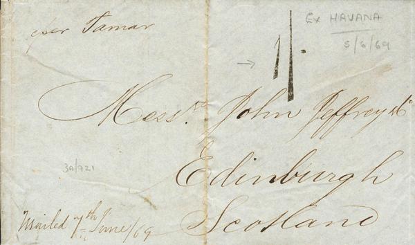 1869. HAVANA to EDINBURGH (SCOTIA), circulated via Saint Thomas. Manuscript "Per Tamar" and bearing mark 1 / - (shilling), in black. MAGNIFICENT AND RARE.