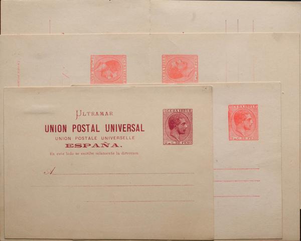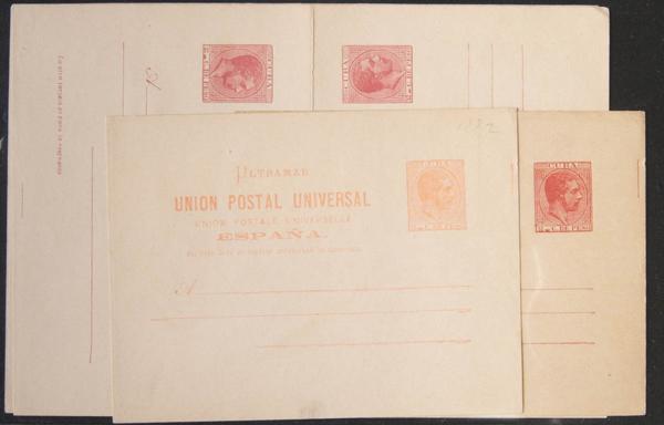 (★) EP11Ca, EP12Ca. 1882. 2 cts + 2 cts carmine and 3 cts + 3 cts pink on Entire Post Cards, both with the "SIN TILDE EN LA Ñ" variety from Spain. MAGNIFICENT AND RARE. (Laiz 2006, 230 Euros)