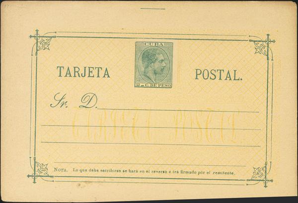 (★) EP16f. 1882. 2 green cents on Whole Postal Card. Variety YELLOW BACKGROUND. MAGNIFICENT. Edifil 2019: 165 Euros