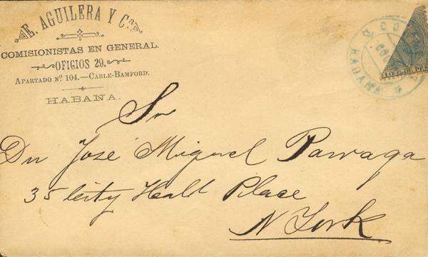103. 1888. 10 cts blue, BISECTED. HAVANA to NEW YORK. Postmark CORREOS / HABANA, in blue. Advertising on the back. MAGNIFICENT AND RARE.