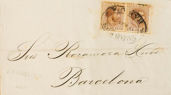 102(2). 1885. 10 chestnut cts, pair. HAVANA to BARCELONA. POSTMARK POSTMARK / HAVANA. MAGNIFICENT AND VERY RARE.