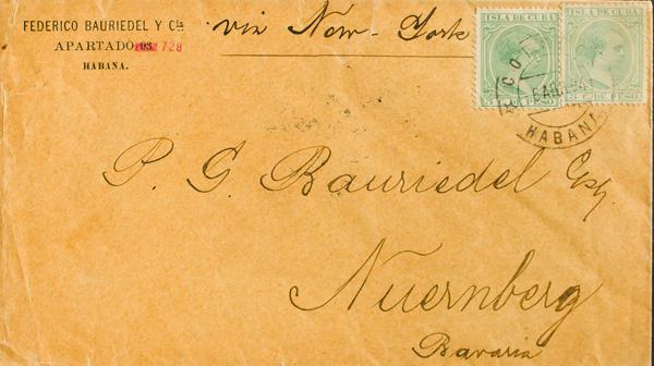 127(2). 1891. 5 cts green, pair. HAVANA to NUREMBERG (GERMANY). On the back arrival. MAGNIFICENT AND RARE DESTINATION.