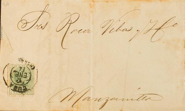 |ENVELOPE| 77, 80A. 1883. 5 cents on 5 cents, two stamps (Type b and c). Addressed to BAGUR (GERONA). Arrival on the back. MAGNIFICENT AND VERY RARE USE OF THE SPIDER ISSUE. Cert. COMEX.