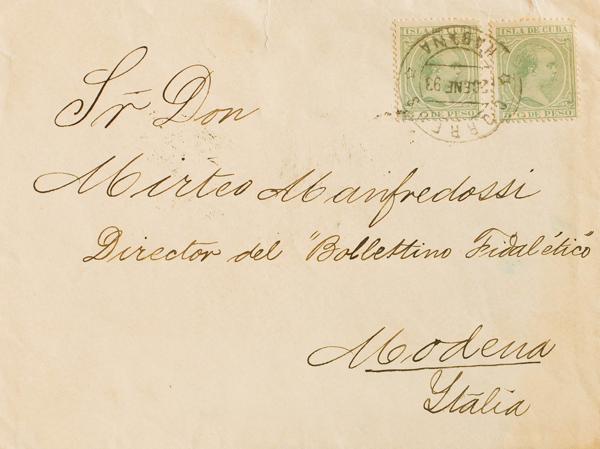 127(2). 1893. 5 cts green, pair. HAVANA to MODENA (ITALY). On the back arrival. MAGNIFICENT AND UNUSUAL DESTINATION.