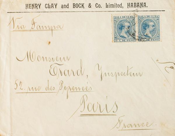 127(2). 1897. 5 blue cts, pair. Letter circulated by the ARMY OF OPERATIONS IN THE ISLAND OF CUBA from SANTO DOMINGO (CUBA) to BILBAO, "VÃa Tampa". Postmark SANTO DOMIGO / CORREOS CUBA, in blue. MAGNIFICENT AND VERY RARE AND SPECTACULAR WITH THE LETTERHEAD OF THE ARMY.