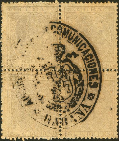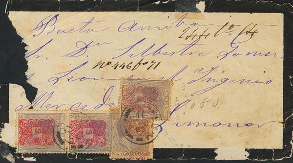 77A(3), 80. 1885. 5 cts over blue gray 5 cents, three stamps and 5 cts over blue gray 5 cents. Front of Certificate from HAVANA to LIMONAR (with small usual defects in fronts from certified letters). On the front, Certificate Number, various notes and on the back "I received", as is customary in certified mail. BEAUTIFUL AND EXTREMELY RARE, ESPECIALLY FRANKED WITH THE ISSUE OF "Spiders", ALMOST IN ALL PROBABILITY THE ONLY CERTIFIED LETTER IN THIS POPULAR ISSUE. Certificate ECHENAGUSIA.