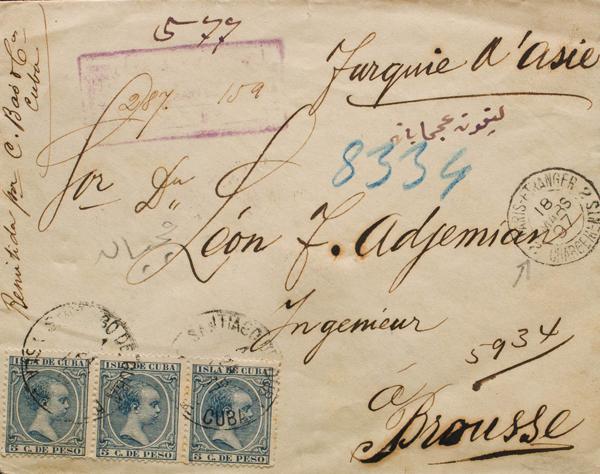 149(3). 1897. Blue 5 cents, strip of three. SANTIAGO DE CUBA to BURSA (TURKEY). PARIS-ETRANGER / CHARGEMENTS transit dater on the front and Galata transit and arrival on the back. MAGNIFICENT AND VERY RARE DESTINATION, ESPECIALLY WITH ORIGIN IN CUBA.