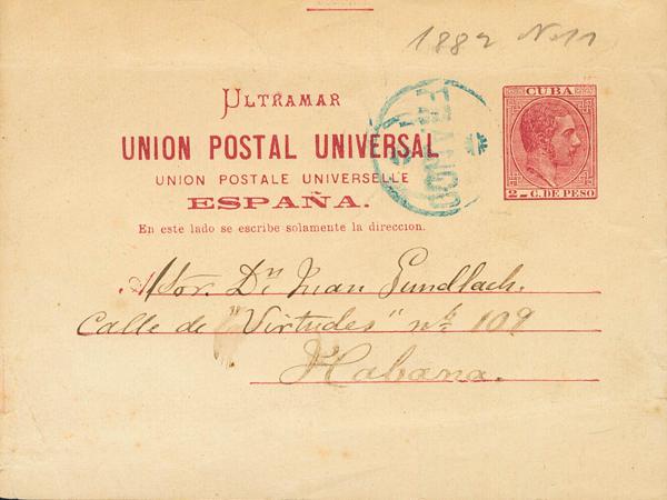 EP22. 1893. 2 cents carmine on Entire Post Card from COTORRO (CUBA) to HAVANA. Postmark FRANCO, in blue and on the back arrival. MAGNIFICENT AND VERY RARE ORIGIN OF A CUBAN POSTCARD STATIONERY.