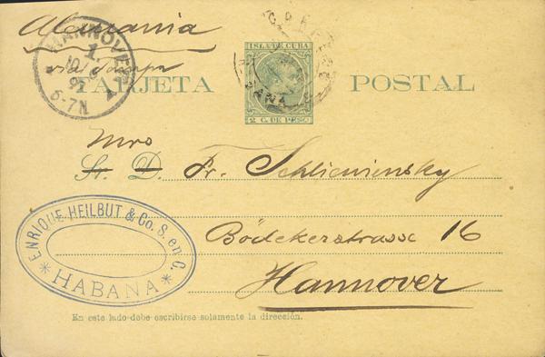 EP27A. 1897. 2 green cents on Whole Postal Card from HAVANA to HANNOVER (GERMANY). At the front arrival. MAGNIFICENT.