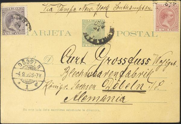 EP27A. 1896. 2 green cents on Postal Card from HAVANA to DOBELN (GERMANY), with complementary postage of 1 violet cent and 2 pink cents, circulated via Tampa, New York and Southampton. At the front arrival. MAGNIFICENT AND EXTRAORDINARY RARE POSTAGE, ANOTHER TWIN WHOLE IS KNOWN TO THIS REPRODUCED IN LAIZ'S WORK. Cert. EMF.