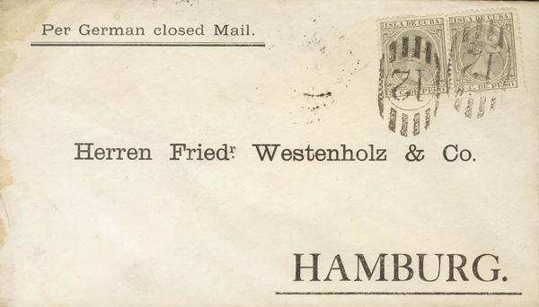 |ENVELOPE| 149(2), 151. 1897. 5 cts blue, two stamps and 20 cts mauve. HAVANA to HAMBURG. Postmark number "12" and on the front printed PER GERMAN CLOSED MAIL. MAGNIFICENT.