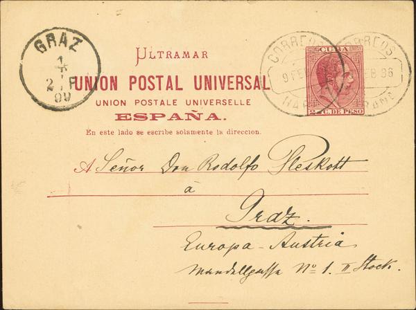 EP27, 146. 1896. 2 cents green on Stationery Card from HAVANA to BRNO (current Czech Republic), with additional postage of 1 cent purple, and forwarded to LETOVICE. On the front handwritten "Via Tampa and New York" and arrivals. MAGNIFICENT AND VERY RARE DESTINATION WITH ORIGIN IN CUBA.