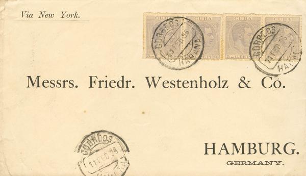 |ENVELOPE| 100(4). 1886. 5 cents blue-gray, four stamps. HAVANA to HAMBURG (GERMANY), circulated via New York. Arrival on the back. MAGNIFICENT.