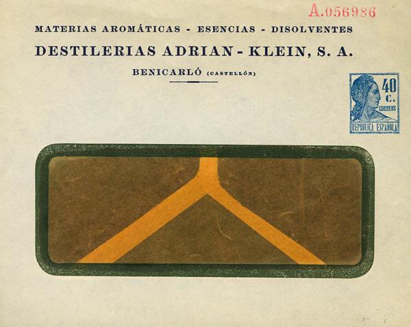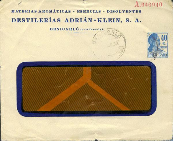 (★) EP1292. 1933. 40 cts on Entire Postal Private DESTILERIAS ADRIAN KLEIN SA BENICARLO. MAGNIFICENT AND RARE IN NEW. (Laiz 2000: 210 euros)