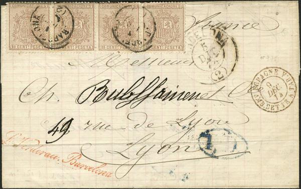 153(4). 1874. 10 chestnut cts, strip of four. BARCELONA to LYON (FRANCE). MAGNIFICENT.