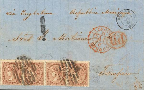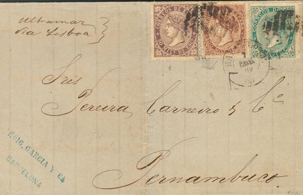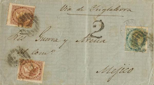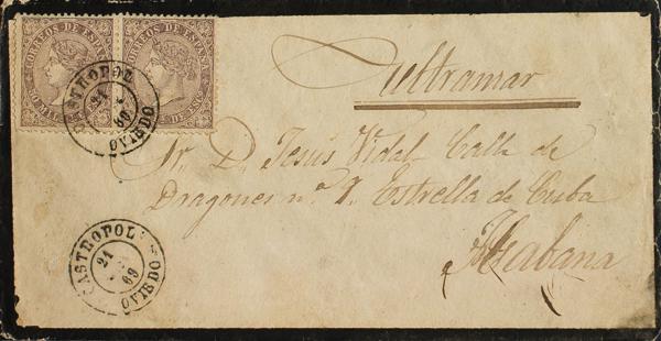 100(2). 1869. 200 mils green, pair. ESTELLA to MANILA (PHILIPPINES). Postmark ESTELLA / NAVARRA. MAGNIFICENT AND VERY RARE DOUBLE PORTION ADDRESSED TO THE PHILIPPINES.