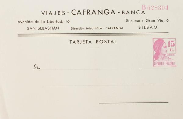 (★) EP1069. 1936. 15 cts on Private Postal Entire Card VIAJES-CAFRANGA-BANCA. MAGNIFICENT AND RARE IN NEW. (Laiz 2000: 210 euros)
