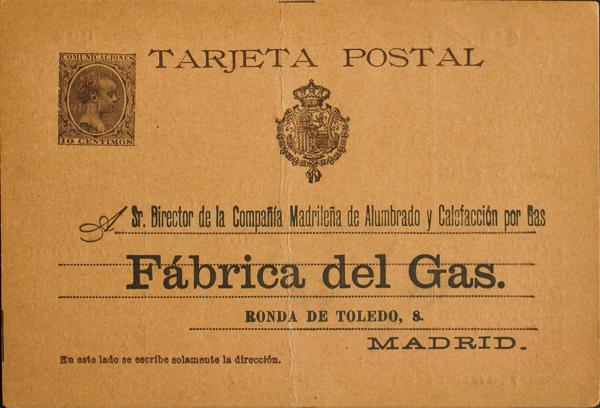 (★) EP36. 1897. 10 cts brown on Entire Post Card with FABRICA DEL GAS Private Preprint, front and back. MAGNIFICENT AND VERY RARE. Edifil 2015: ++178 Euros