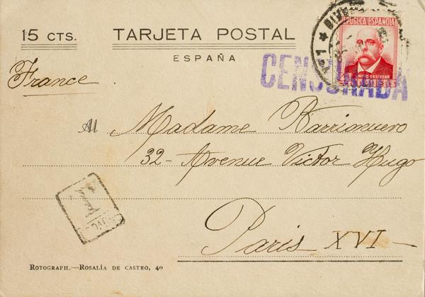 736. 1938. 40 cts carmine. Postal Card with 15 cts surcharge of Private Initiative from MADRID to PARIS (FRANCE). Priced on arrival without applying the postage. MAGNIFICENT AND RARE.