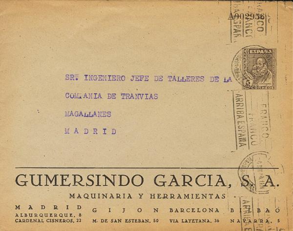 EP1422. 1941. 5 cts chestnut gray Entire Envelope Private Postal GUMERSINDO GARCIA SA Internal Mail of MADRID. MAGNIFICENT AND RARE. (Laiz 2006, 600 Euros)