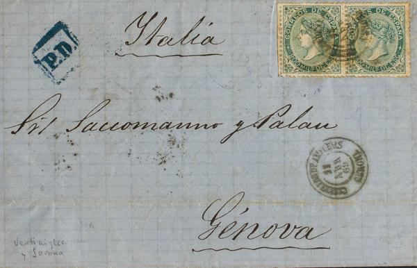 100(2). 1869. 200 mils green, pair. CASTELLON DE AMPURIAS to GENOVA (ITALY). Postmark CASTELLON DE AMPURIAS / GERONA. MAGNIFICENT AND RARE DOUBLE PORTION TO ITALY.
