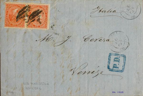 100A(2). 1869. 12 vermilion cuartos , pair. BARCELONA to VENICE (ITALY). MAGNIFICENT AND VERY RARE DESTINATION TO VENICE.