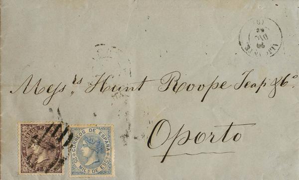 100A, 98. 1869. 12 cuartos vermilion and 50 mils violet (hidden by the 12 cuartos). TOLOSA to BAYONNE (FRANCE). The recipient realizes that the 50-mil stamp is invalid and substitutes the correct 12- cuartos stamp. Postmark TOLOSA / SN SEBASTIAN. MAGNIFICENT AND RARE.