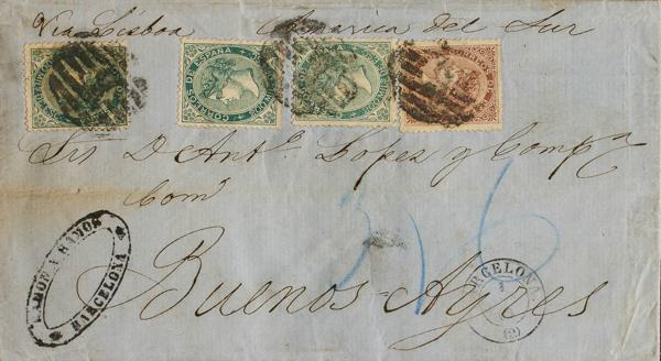 100. 1869. 200 mils green. BARCELONA to GENOA (ITALY). Postmark BARCELONA / (2). MAGNIFICENT AND UNUSUAL DOUBLE POSTAGE POSTAGE TO ITALY.