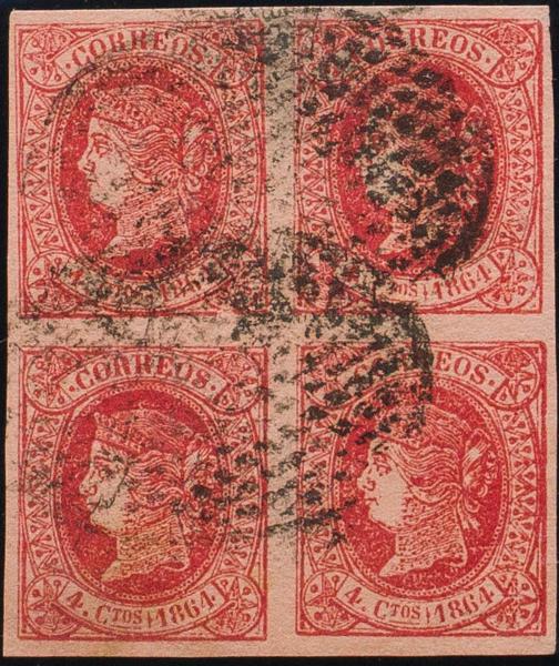 64(4). 1864. 4 red cuartos , block of four (one stamp with a small defect). CASTROJERIZ pre-philatelic postmark. BEAUTIFUL AND VERY RARE.