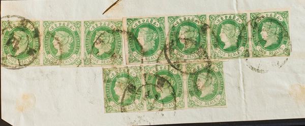 △ 62(17). 1863. 2 reales green, block of seventeen, on fragment. Postmark R. CARRETA Nº1. MAGNIFICENT AND RARE.