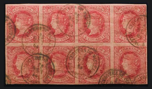 64(63). 1864. 4 red cuartos , block of sixty-three. Postmark MANACOR / BALEARIC ISLANDS. MAGNIFICENT AND VERY RARE BLOCK OF THIS SIZE.