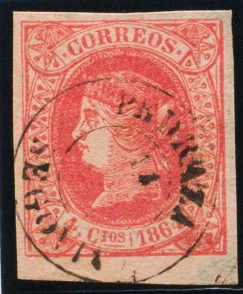64. 1864. 4 red cuartos . Postmark CABUERNIGA VALLEY / SANTANDER. MAGNIFICENT AND RARE.