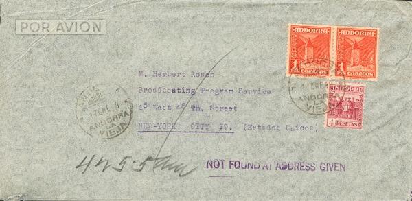 42, 54(2). 1949. 1 pts, couple and 4 pts. Air Charter from ANDORRA LA VIEJA to NEW YORK. On the front "NOT FOUND AT ADDRESS GIVEN". MAGNIFICENT.