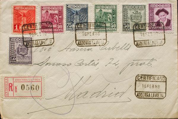48, 50/55. 1948. Various values. Certificate from ANDORRA LA VIEJA to MADRID. On the back arrival. MAGNIFICENT.