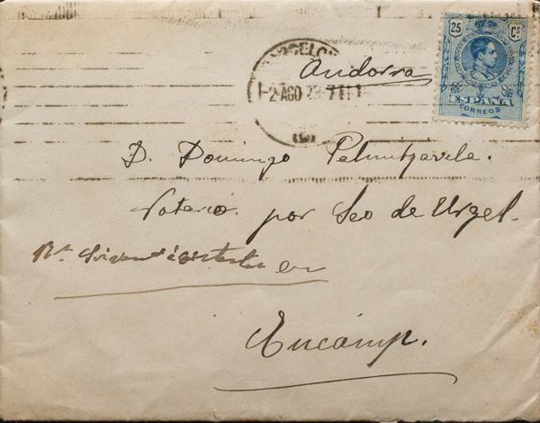Spain, 274. 1929. 25 cts blue (medallion). BARCELONA to ENCAMP (ANDORRA). MAGNIFICENT AND VERY RARE ADDRESSED TO ANDORRA.