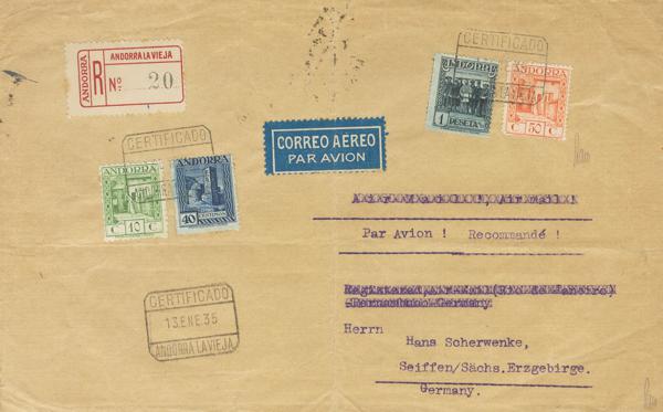 22/24, 17d. 1935. 40 cts blue, 50 cts orange, 1 pts slate and 10 cts green. Certificate from ANDORRA LA VIEJA to SEIFFEN (GERMANY). On the back arrival. MAGNIFICENT AND RARE.