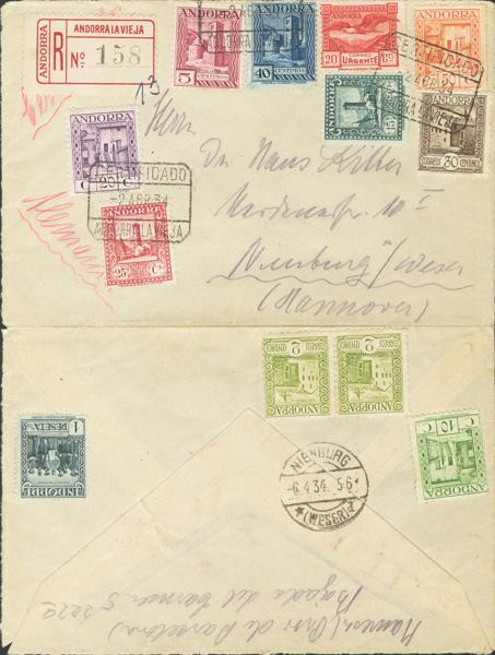 15/21d, 22/24. 1934. Various values ​​(on the back 2 cts, 10 cts and 1 pts without postmark). Certificate from ANDORRA LA VIEJA to NIENBURG (GERMANY). On the back arrival. MAGNIFICENT AND RARE POSTAGE COMBINATION.