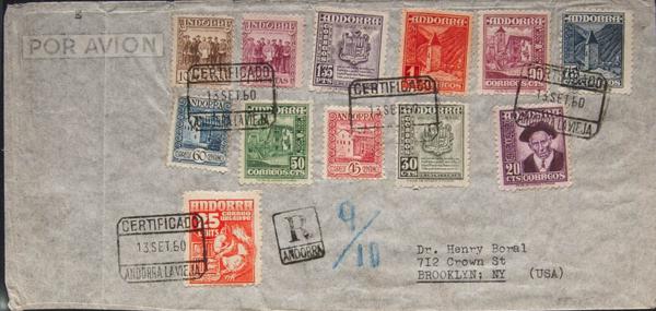 48, 50/55, 58, 38, 40, 42/43. 1950. Various values, 4 pts carmine and 10 pts chestnut. Certificate from ANDORRA LA VIEJA to NEW YORK (USA). On the back arrival. MAGNIFICENT AND SPECTACULAR POSTAGE.